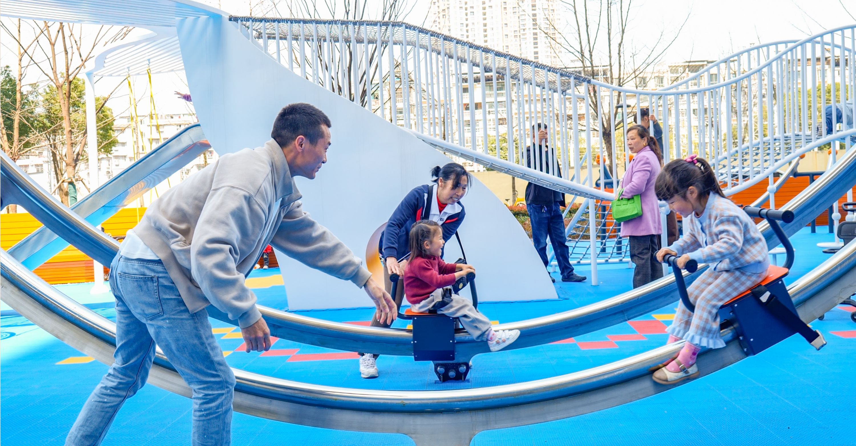 550米蓝色环形跑道象征着海浪围绕,白色鲸鱼畅游其中。记者在现场看到,独特造型下设置了攀爬架、滑梯、秋千、吊环、摇摇椅等设施,适合6岁前的低龄儿童游玩。往前走,一组迷你坡道与滑道错落相连,形成趣味挑战空间,适合6岁至9岁儿童开展轮滑、滑板、独轮车等运动。再往后,圆形趣味三人篮球场则可以满足年龄更大的儿童的需求。