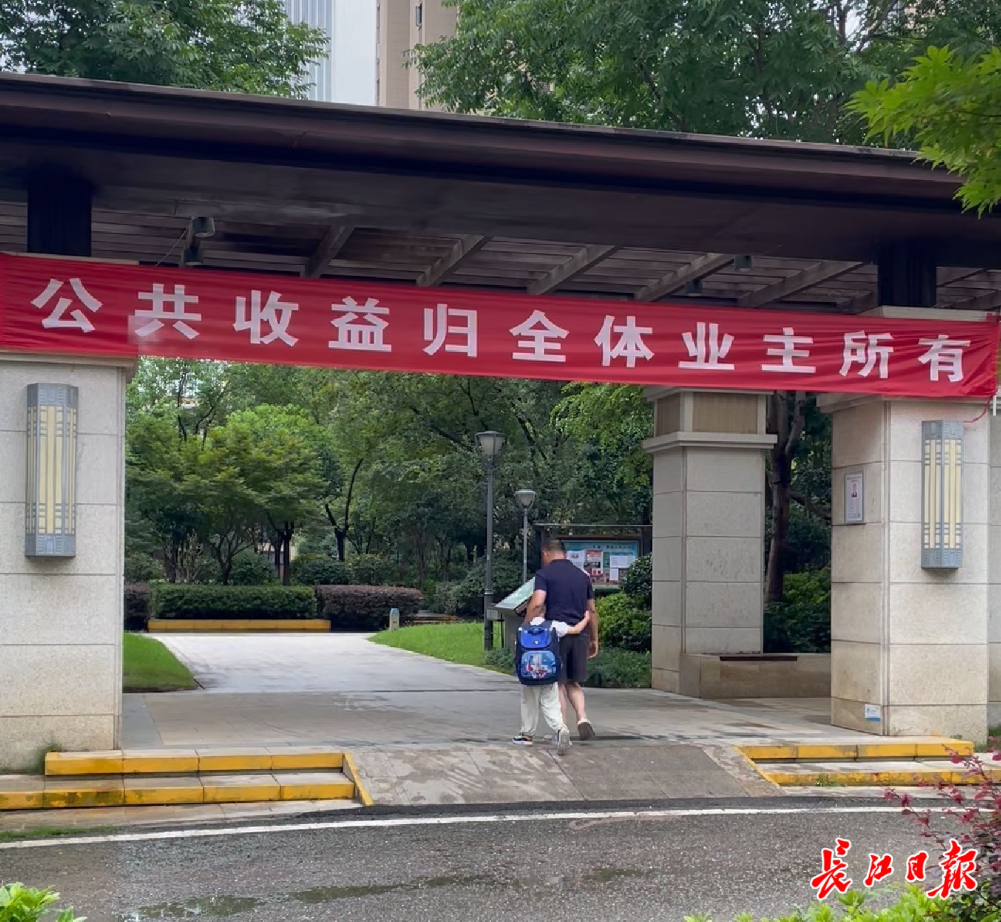 绿地汉口中心小区内,张挂着公共收益的宣传条幅。记者杨荣峰摄