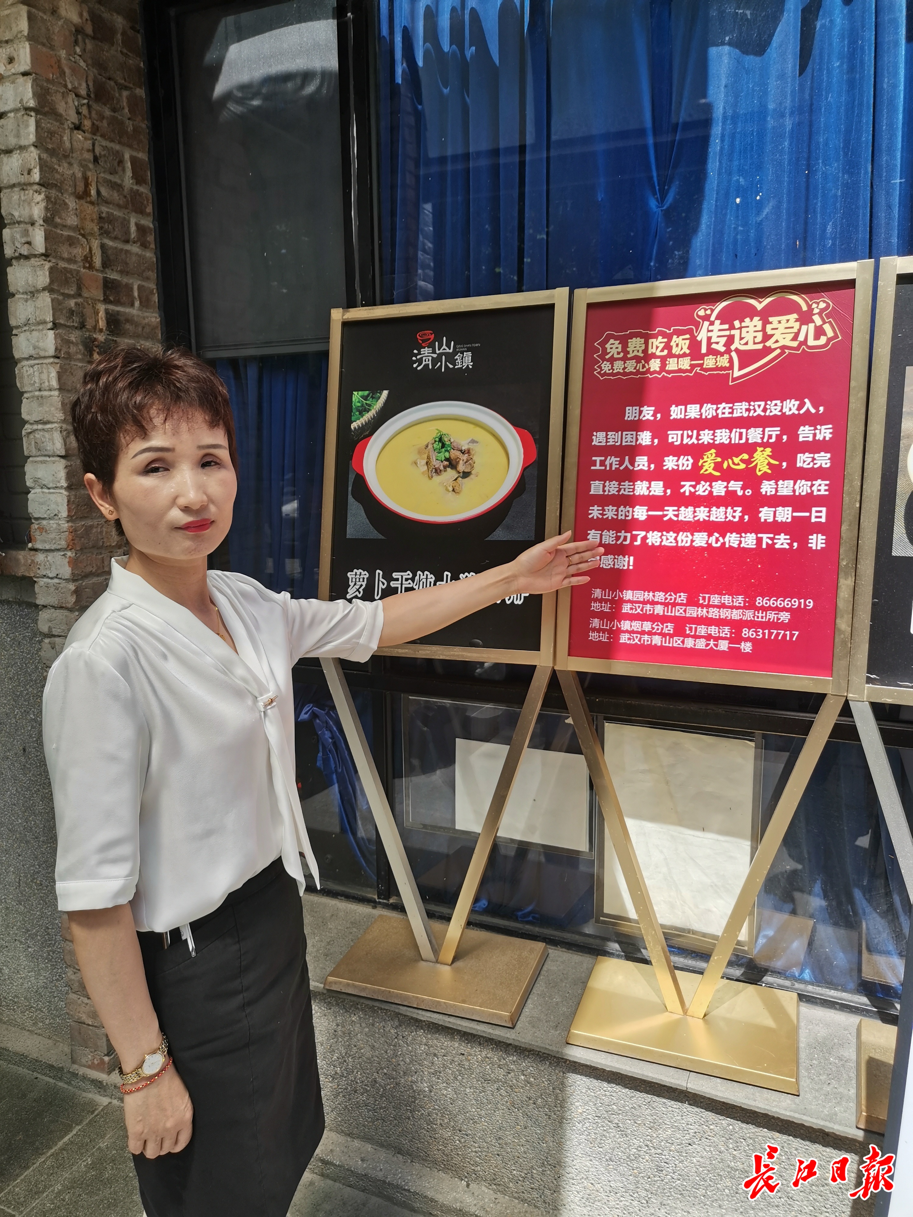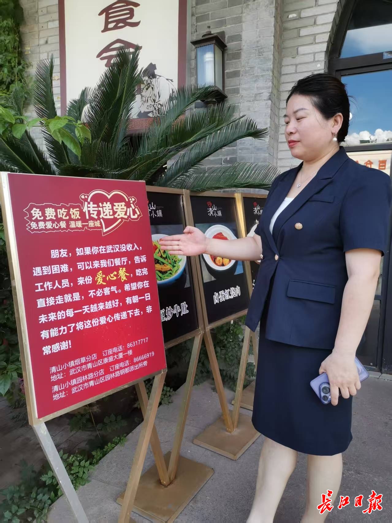 清山小镇园林路分店位于青山园林路,餐厅门口张贴的“免费吃饭”海报和烟草分店一样。店长李阳告诉记者,该店从2018年开业起就贴出了海报,每年送出的免费爱心餐超过300份。李阳告诉记者,该店靠近武汉火车站,外地流浪人员上门求助较多。对于单人求助者,店里会赠送两菜一汤的爱心套餐。3人以上求助,他们就会赠送价值百余元的套餐。2023年,曾有六七人登门求助,李阳给他们免费安排了饭菜,对方还给她写过感谢信。