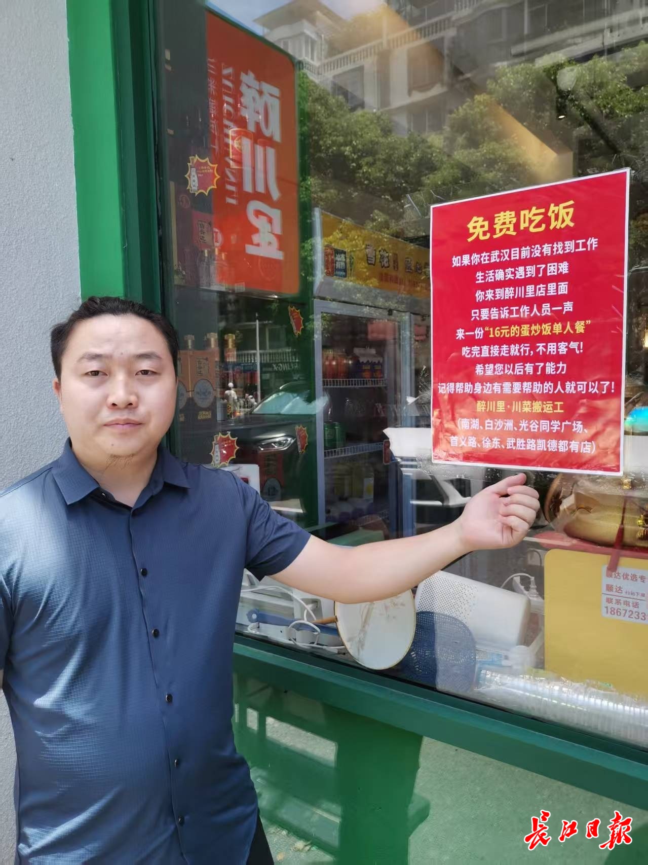 武汉徐东醉川里·川菜搬运工餐厅的大门上,贴着一张显眼的“免费吃饭”海报。33岁的老板孙明忠是四川人,自幼家境贫寒,从小吃百家饭长大。2019年,他在武汉创立了醉川里品牌,目前已有6家连锁店。今年1月初,他贴出了海报,受助人只要到店说出“16元蛋炒饭单人餐”这个暗号,即可在任意一家餐厅免费吃到一份蛋炒饭套餐,截至目前,他已经送出了数十份爱心餐。