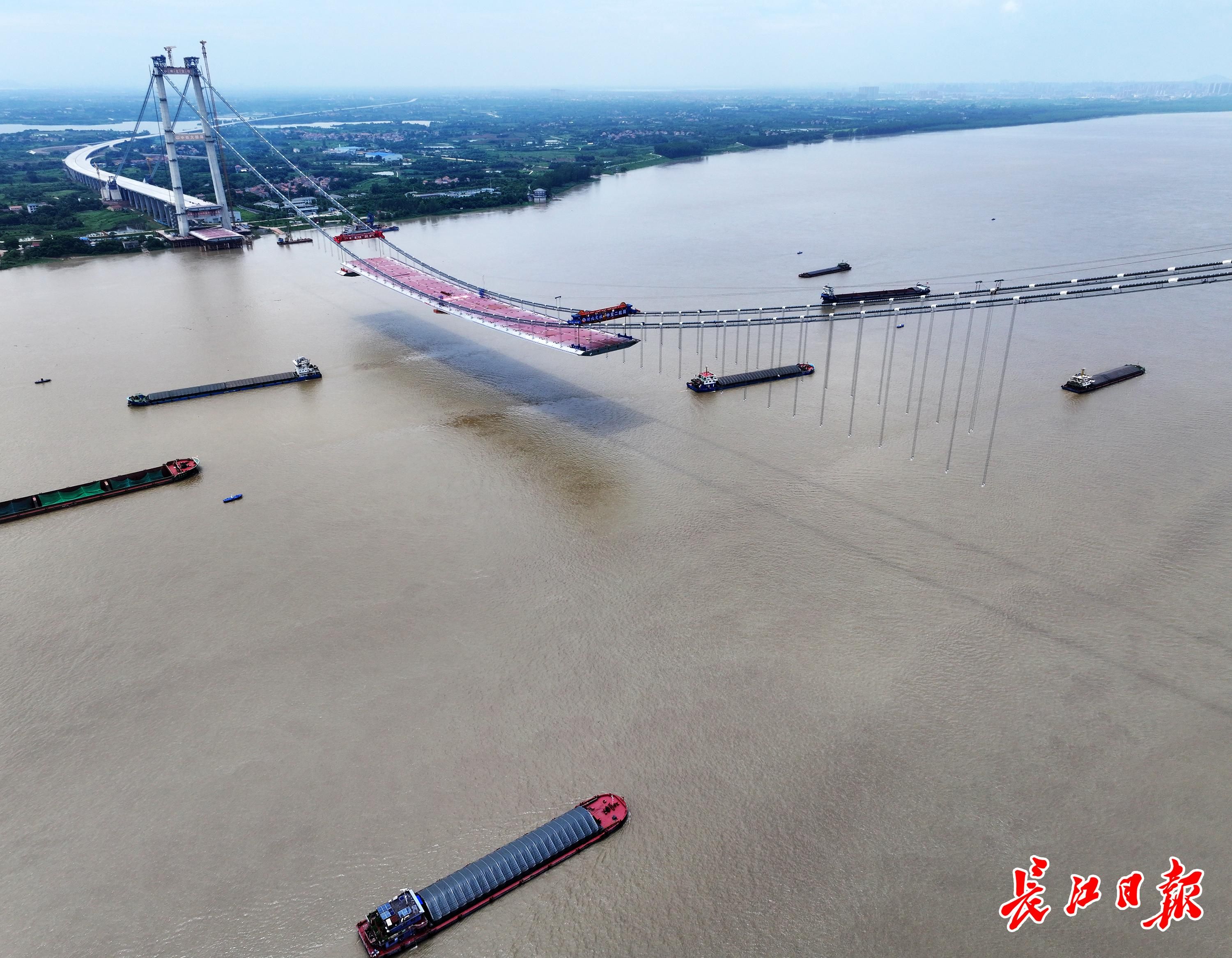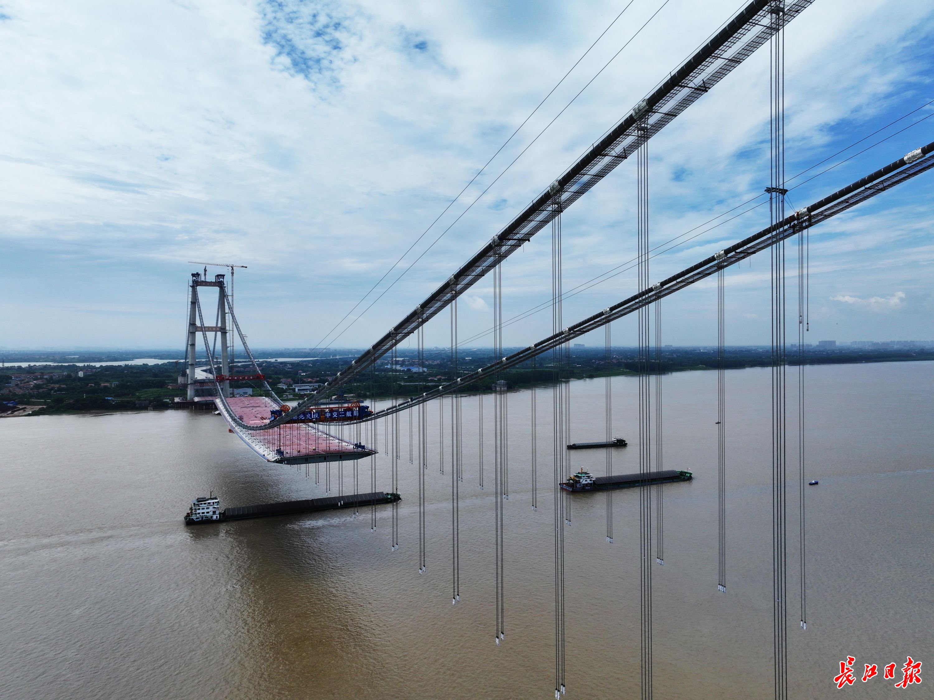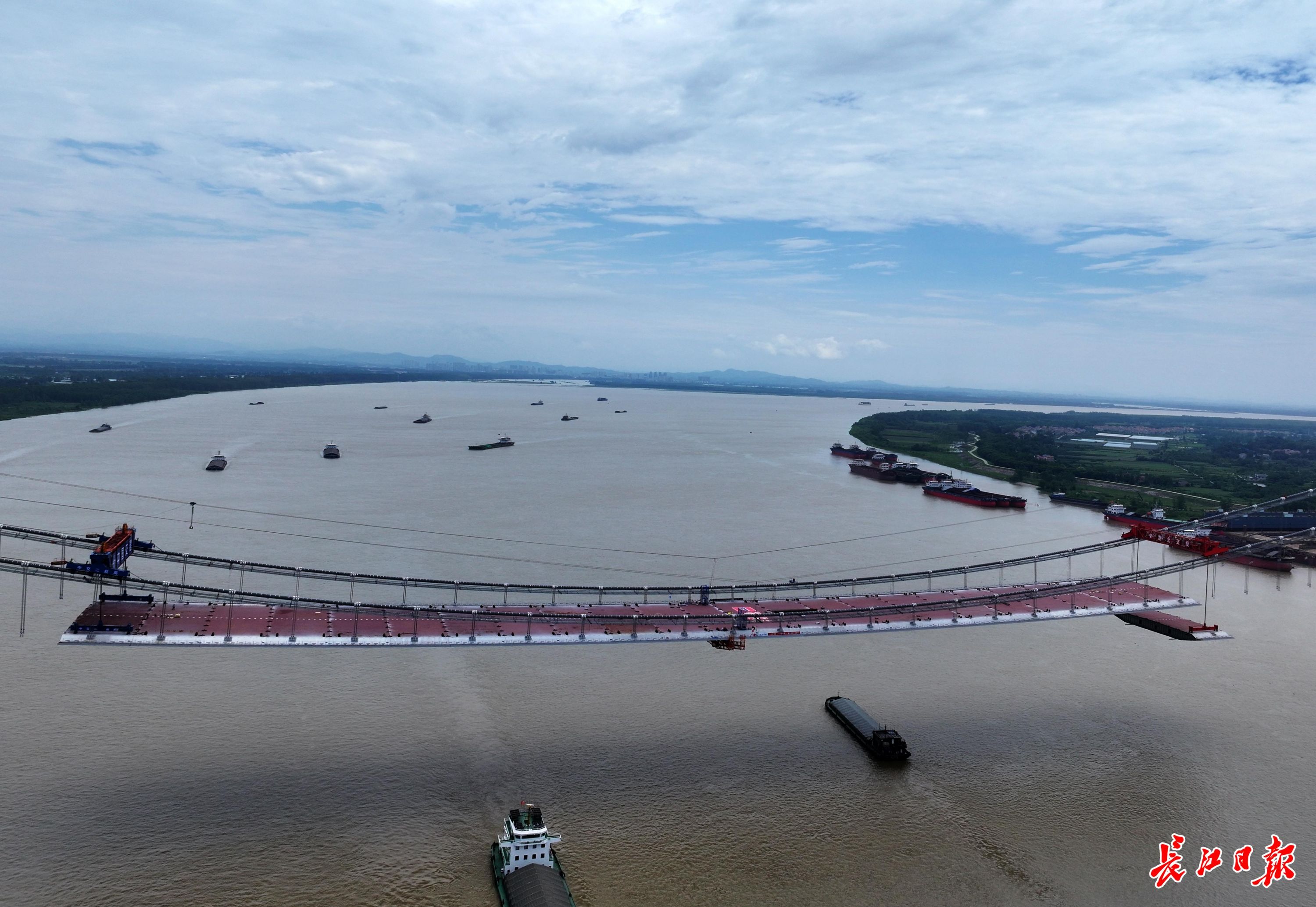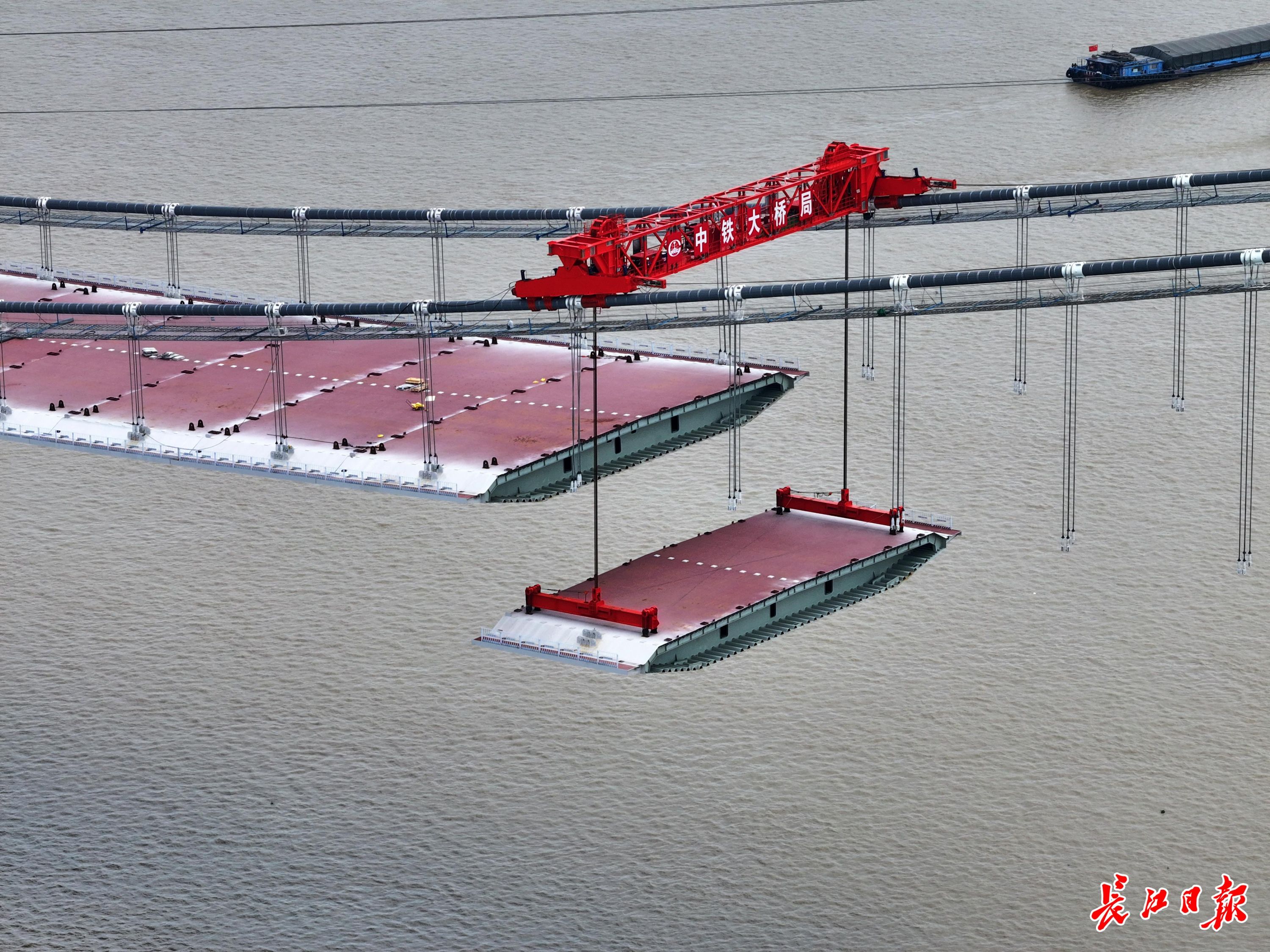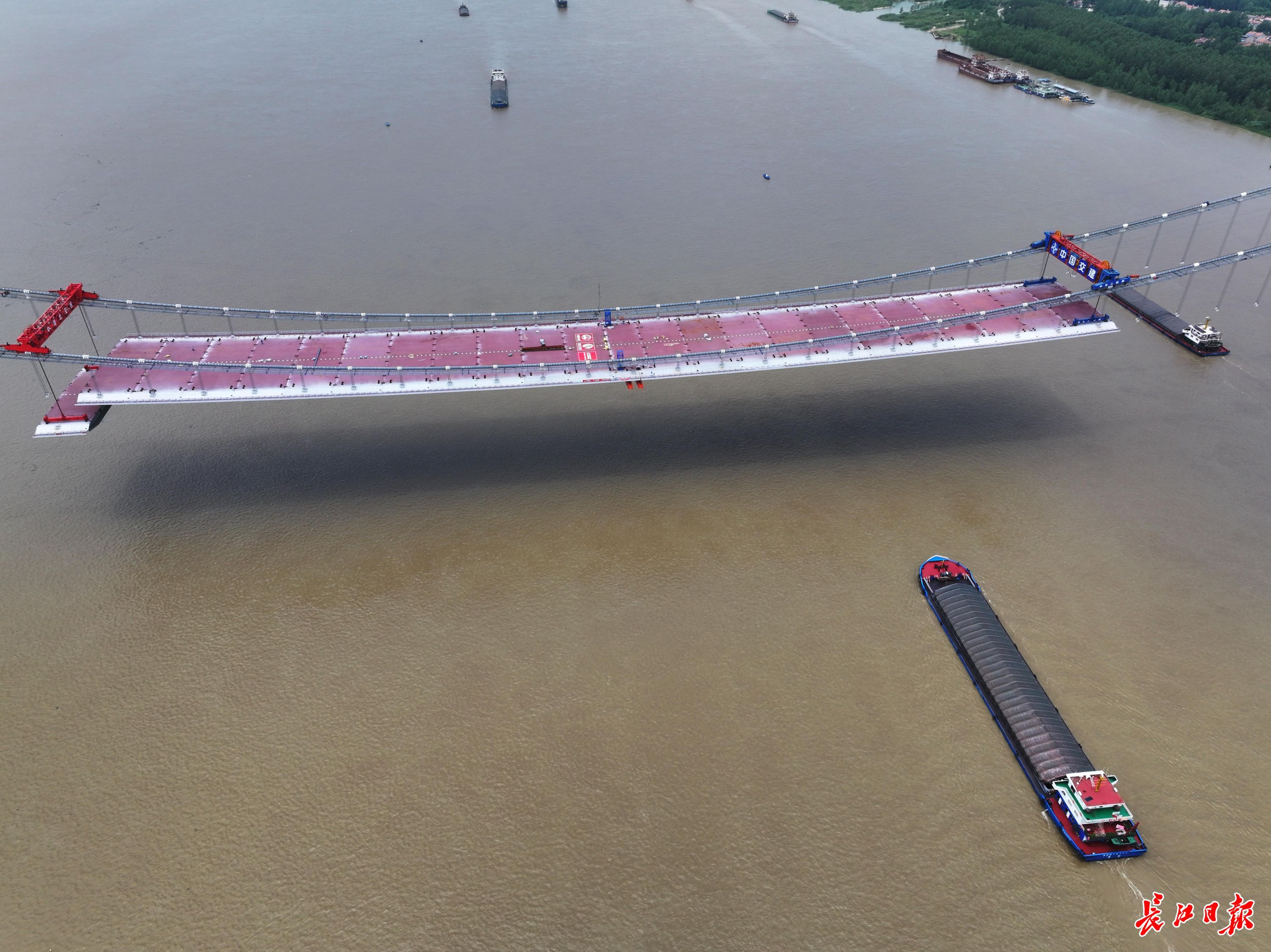 7月1日,记者在现场看到,这些庞然大物由运输船运送至江中心,由缆载吊机吊装到50多米高,然后拼接到位。该桥钢箱梁共分为90个节段进行吊装,南北两岸同步对称施工。其中,中跨钢箱梁长13米、宽50.5米、高4米,新洲侧、鄂州侧的箱梁重量分别为298.6吨、365吨。