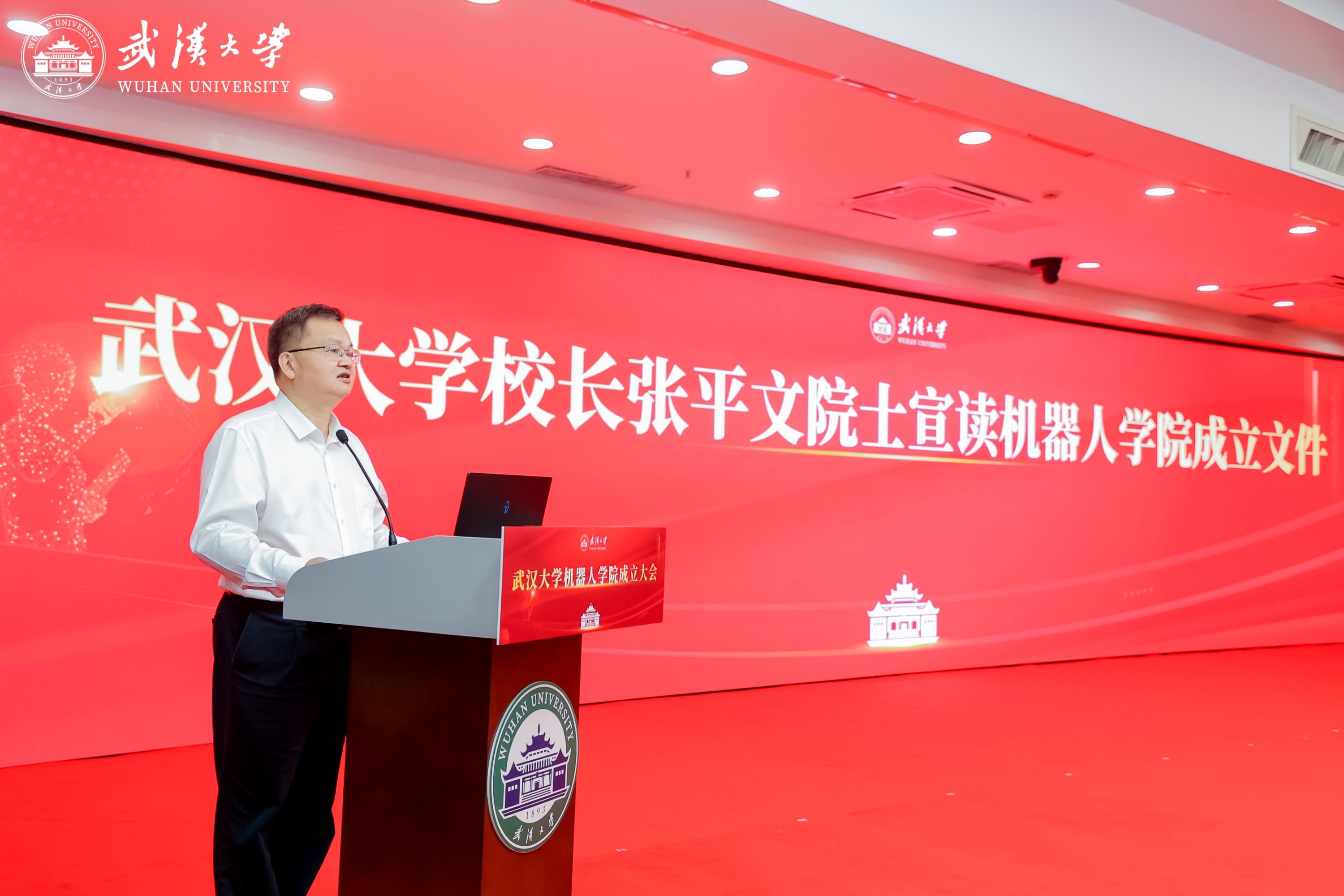 武汉大学校长张平文院士宣读机器人学院成立文件。