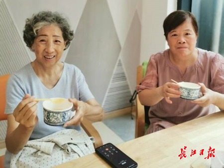 江汉里社区吉年颐养中心幸福食堂内,老人在品尝甜汤。 记者刘睿彻 摄