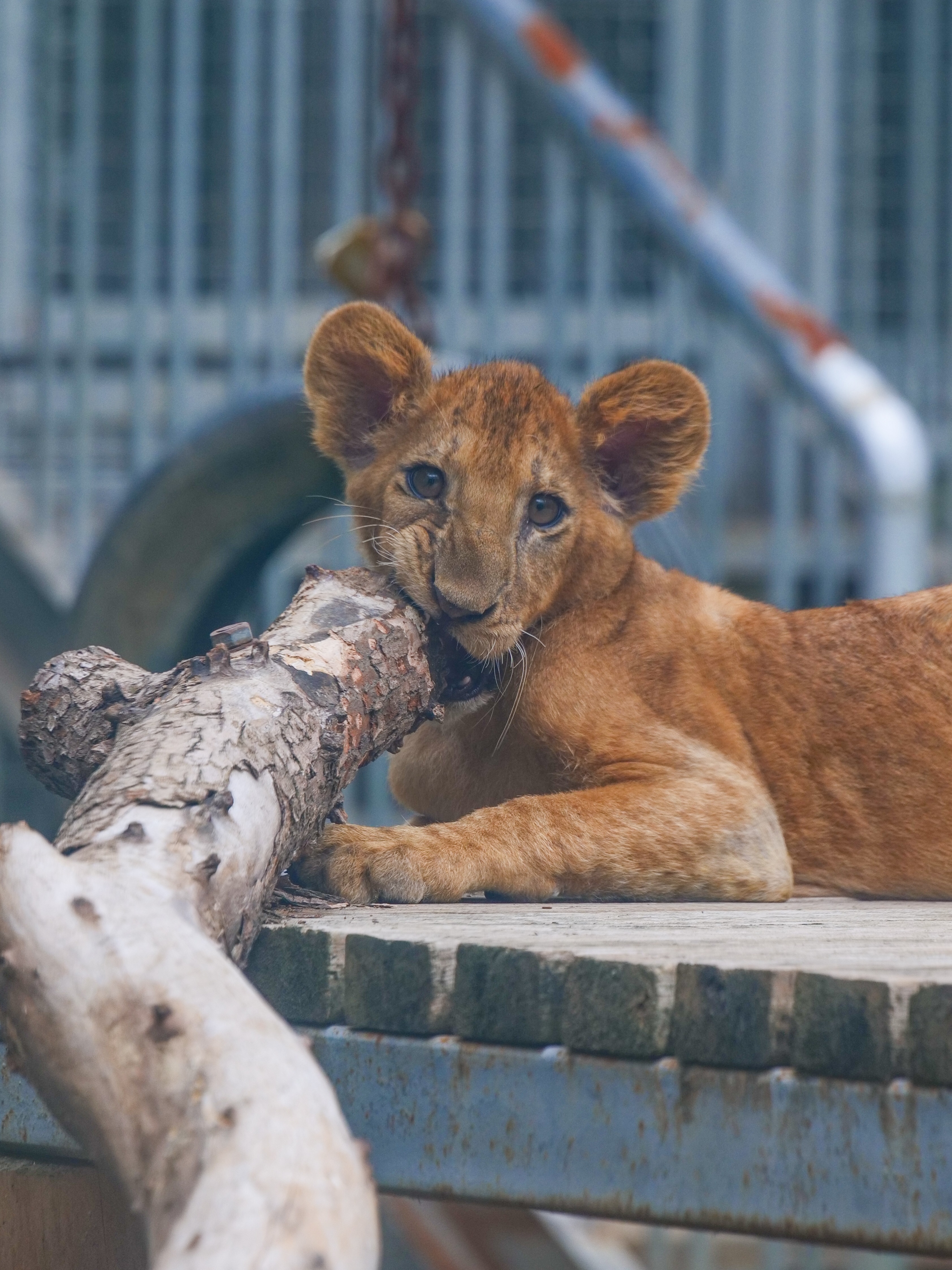 狮宝宝啃木桩磨牙。