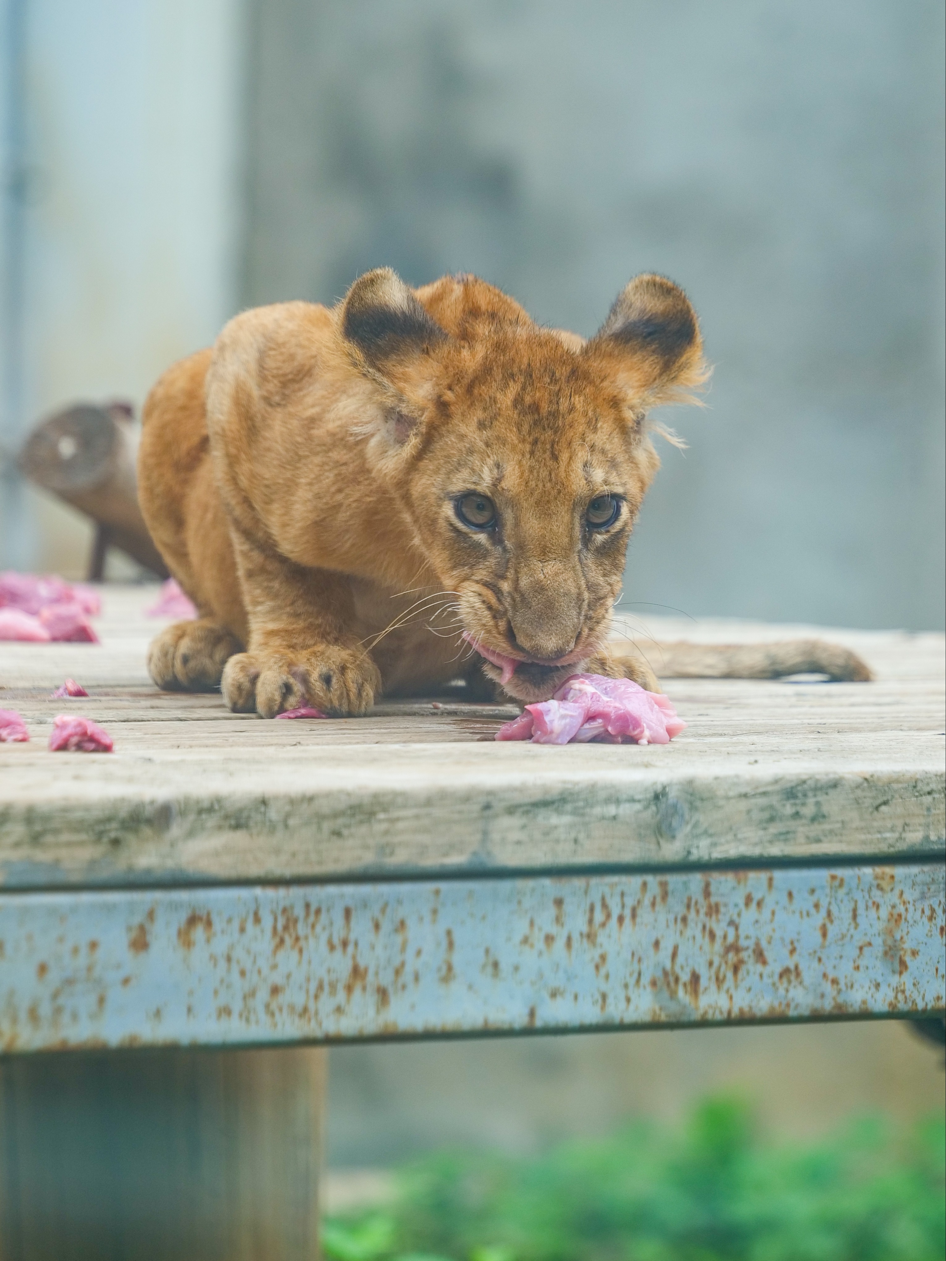 随着幼狮逐渐成长,保育团队逐步调整饲养策略。2个月大时,狮宝宝迎来“吃肉初体验”,保育员会把肉切得碎碎的,帮它们慢慢适应肉食;3个月断奶后,又引导它们正式进入“肉食模式”。现在小狮子长牙了,保育员改成“隔离投喂”,每次一喊“快回来吃饭”,3只小家伙已经形成条件反射,会晃晃悠悠地迈着小步伐走进内馆,形成良好的进食习惯,也对保育员建立起信任。