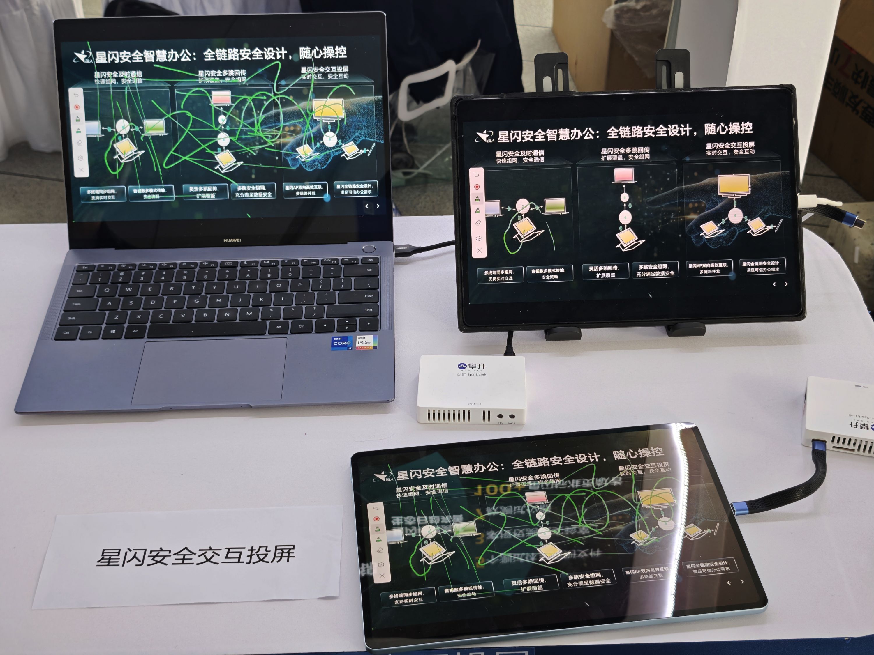 在国际星闪无线短距通信联盟的展台前,武汉攀升鼎承科技有限公司的工作人员正在向参观者介绍星闪投屏装置。“去年我们推出了第一版,现在已经更新为第二版,即将投入市场。”他将U盘大小的白色圆形装置插入平板电脑,手指在屏幕上轻轻滑动,绿色线条随指尖出现在屏幕上,也同步出现在桌上显示屏、笔记本电脑、挂式显示屏上。据了解,这款投屏装置可实现星闪安全交互投屏,替代Wi-Fi和蓝牙技术。