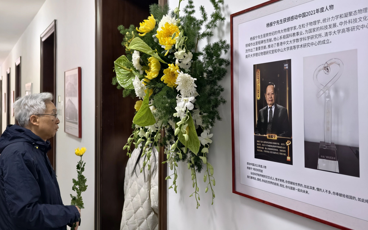 10月19日,一位男士来到清华大学高等研究院悼念杨振宁。新华社记者鞠焕宗 摄