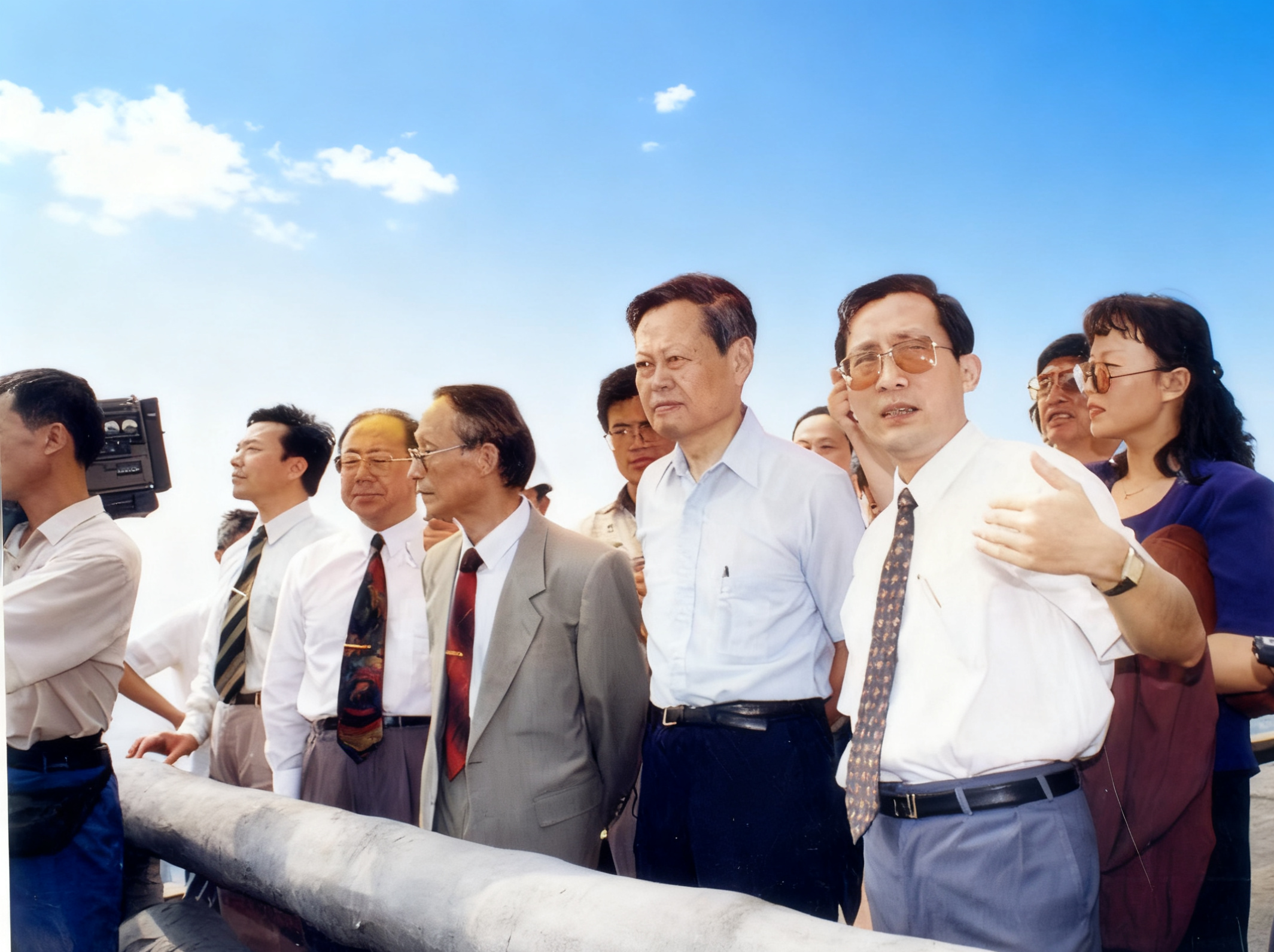 1995年6月,杨振宁到即将通车的武汉长江二桥参观。右二为杨振宁,右三为时任华中理工大学校长杨叔子。辛国胜 摄