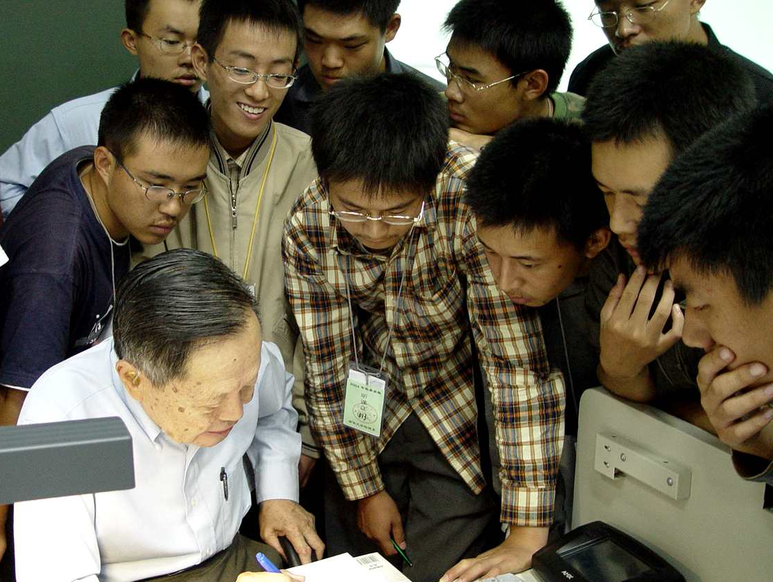 2004年9月,杨振宁在清华大学指导本科生。新华社发