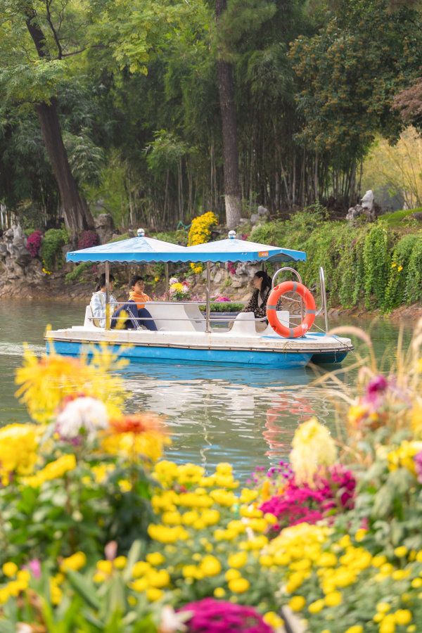 中山公园的“漂浮花船”美到出圈,泛舟湖上看水影菊色交织,菊展现场80余盆“活文物级”盆景,古风爱好者直接穿越成“画中人”。