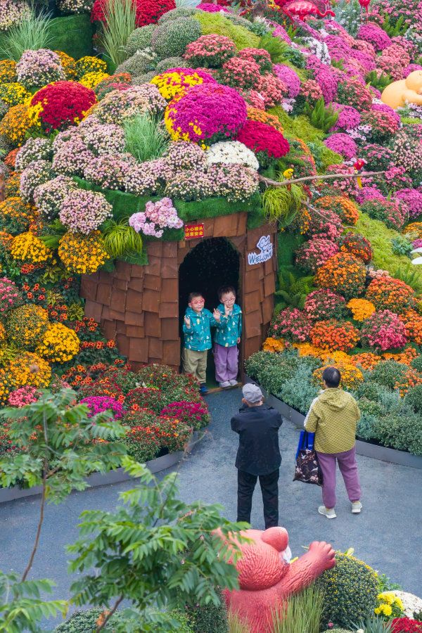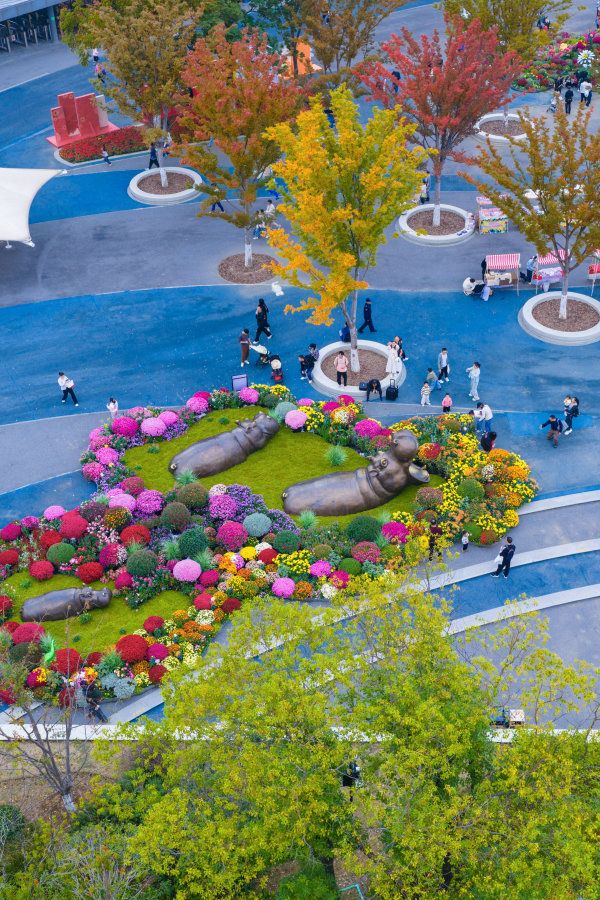 武汉动物园园内园外分区布展,北门免费赏“迎宾花廊”,入园看“萌宠菊花阵”:河马雕塑裹满金菊、小矮人城堡藏在花团里……让带娃家庭直接把这里当成周末“遛娃顶流地”。