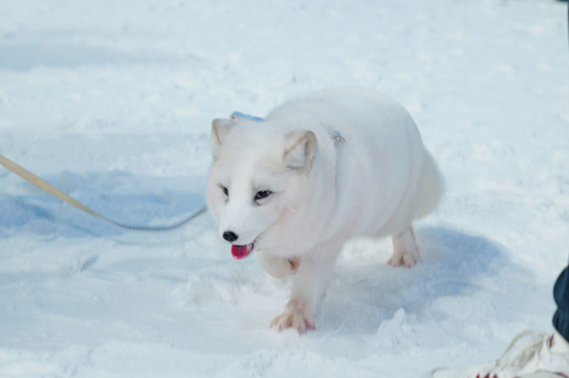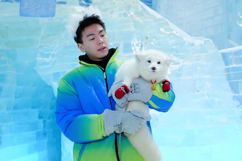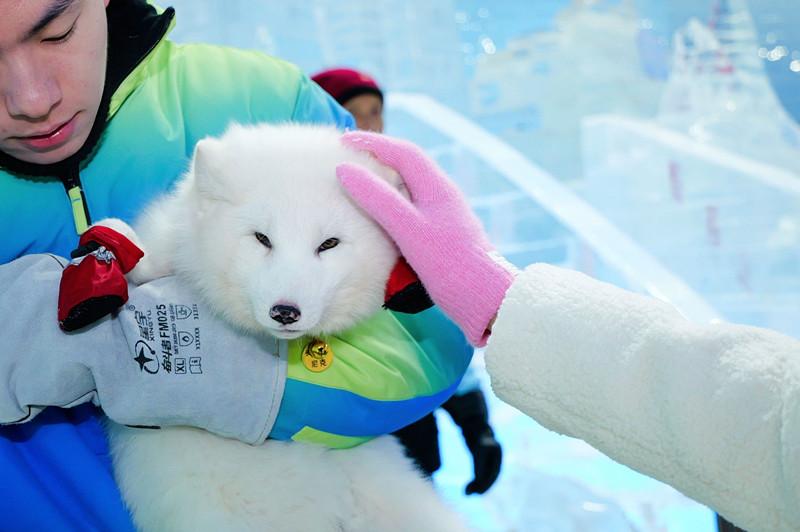 5只雪狐毛色雪白蓬松,眼睛灵动有神。在娱雪区内,它们时而钻过冰雪城堡的隧道,时而好奇地嗅闻周围环境,偶尔还会凑到饲养员身边撒娇,模样憨态可掬。雪狐活动区域旁新增一处桃花源打卡场景,游客可以在这里换上古装,在专业饲养员的指导下与雪狐一起拍摄萌趣十足的合影,还能通过投喂专属饲料与它们互动。