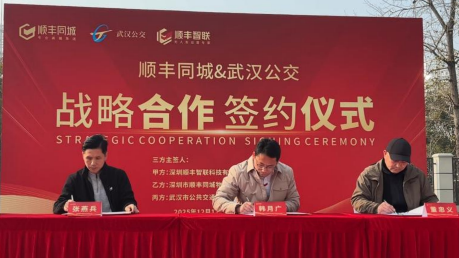 长江日报大武汉客户端12月18日讯(通讯员张丽晶 记者余睿)12月17日,顺丰同城旗下顺丰智联、顺丰同城(武汉)与武汉公交集团正式签署《无人车战略合作框架三方协议》,标志着“公交+无人配送”创新模式在武汉落地。