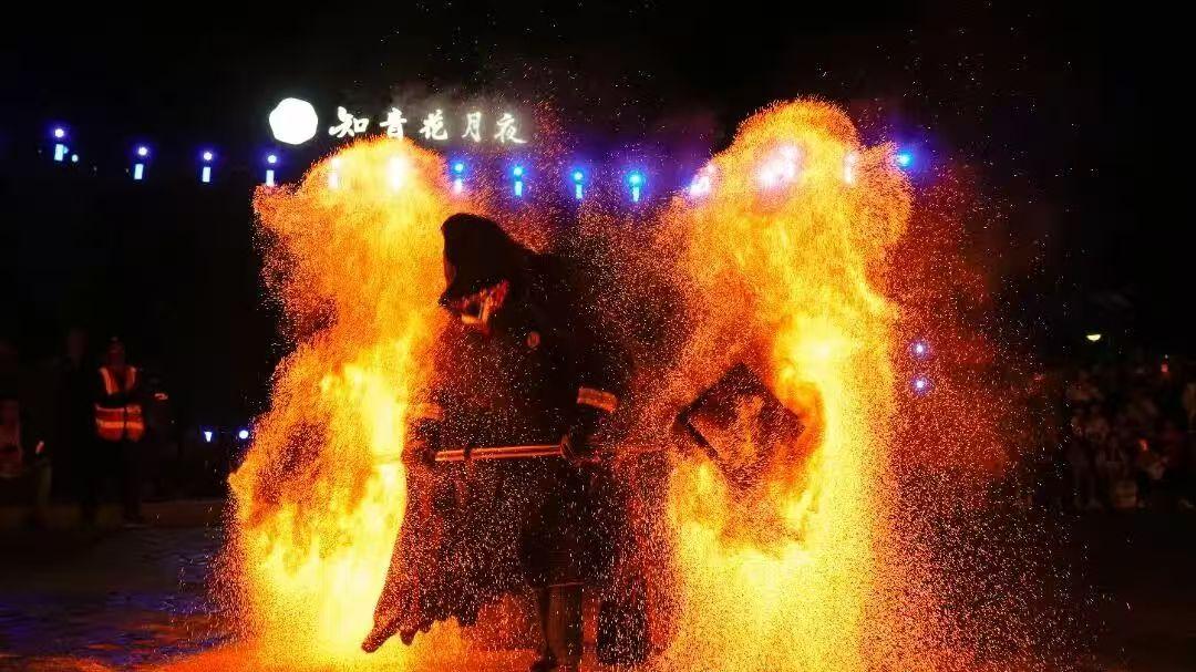 夜幕降临,非遗火秀表演燃爆夜空,成为景区夜间核心亮点。火棍武术、火魔方、火龙枪、吐火特技、火裙舞、九龙喷火枪等十余项非遗高难度火艺绝技轮番登场,炽烈火焰划破夜色,带来震撼十足的视觉冲击。今年景区全新新增“火舞龙狮”特色表演,磅礴龙狮与烈焰火光交相辉映,寓意马年红红火火、福运满堂,尽显传统非遗文化与现代舞台演绎的融合之美。