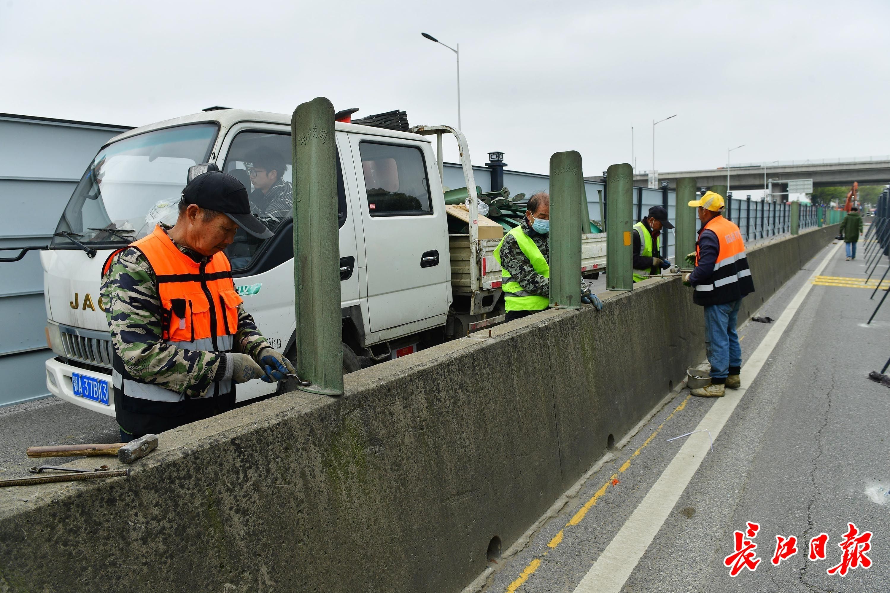 3月19日,107国道东西湖段,施工人员正在拆除路中央隔离墩上的挡板。长江日报记者李永刚 摄