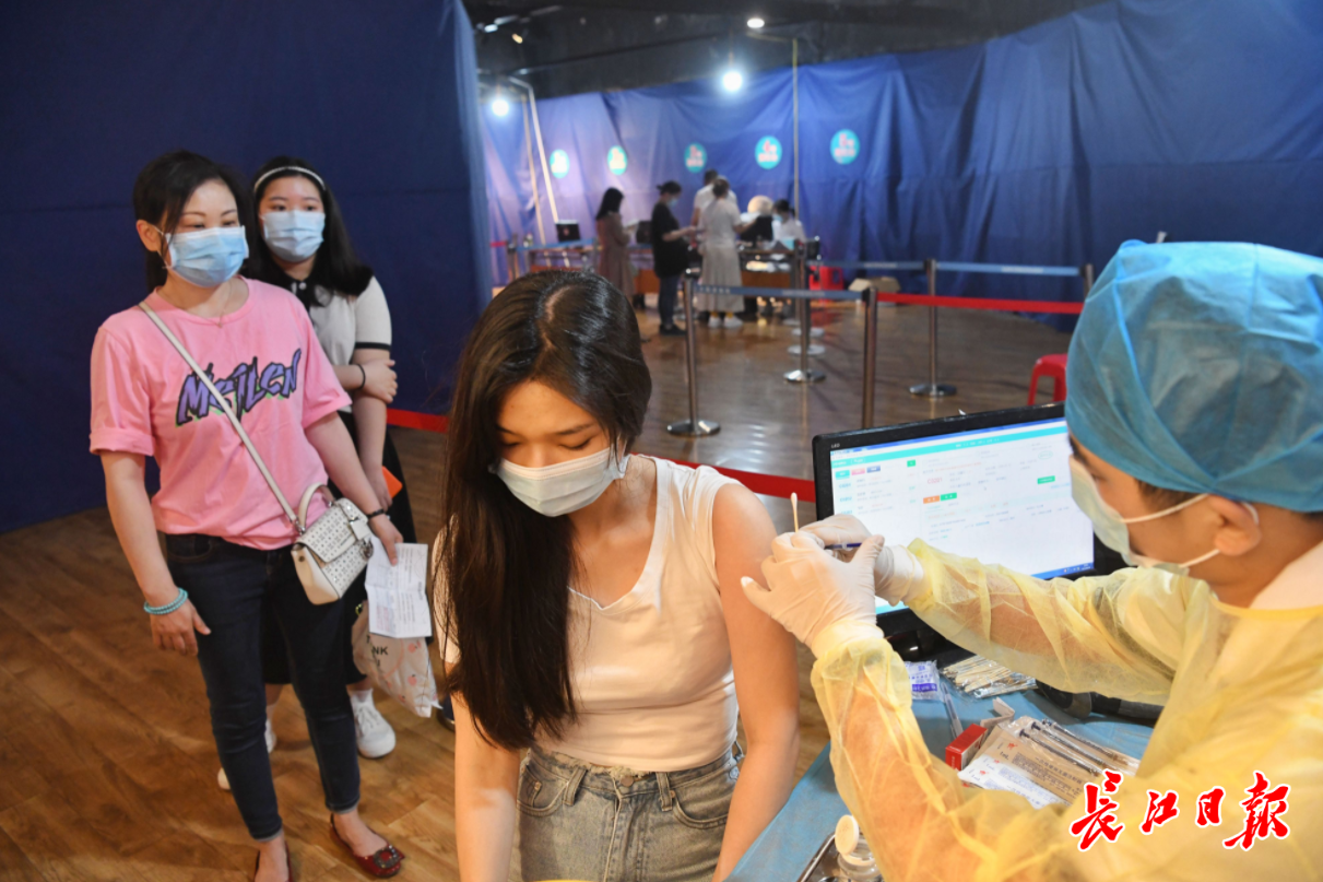 6月18日,江汉区花楼水塔街新冠疫苗免费接种点,市民有序排队接种新冠疫苗。 长江日报记者苗剑 摄