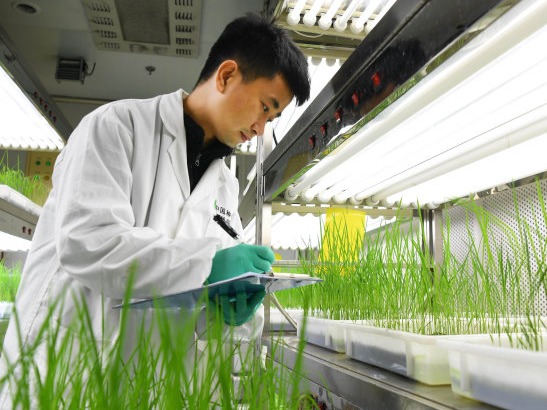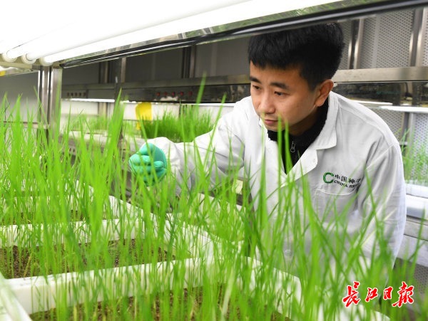中国种子集团有限公司生命科学技术中心水稻生物技术育种平台,黄炜博士在明室观察水稻苗株长势。 记者高勇 摄