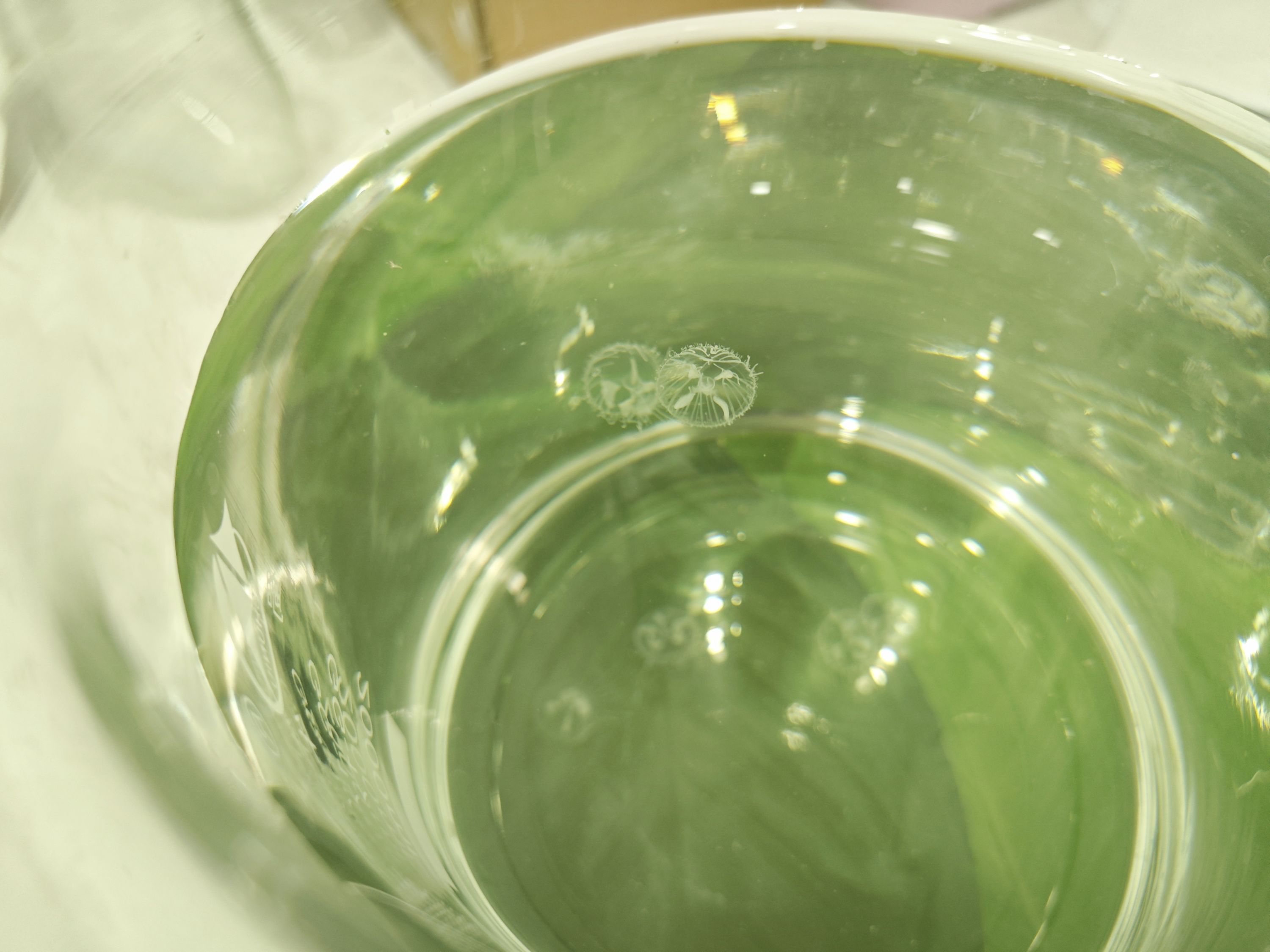 “指甲盖大小忽闪忽闪,感觉像是水母。于是我小心翼翼用手捧着,游回岸边,用塑料盒装了起来。”彭贤说,这些水母在深水区很密集,目测有好几百只。