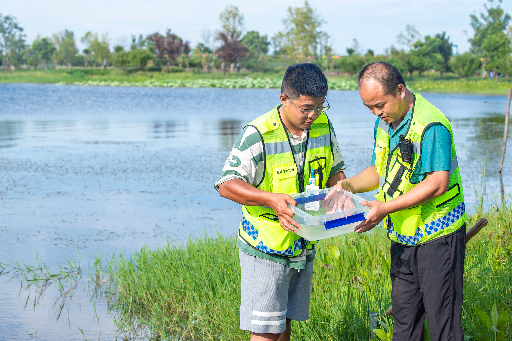 工作人员在湿地湖边采样。 戴东辉 摄