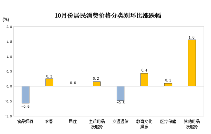 从商品及服务价格变动情况看,构成居民消费的八大类商品及服务价格环比“五涨一平两降”。其中,降幅最大的是食品烟酒,价格下降0.6%,影响CPI下降约0.16个百分点;其次是,交通通信价格下降0.5%。涨幅最大为其他用品及服务,价格上涨1.6%,教育文化娱乐价格上涨0.4%,衣着价格上涨0.3%,生活用品及服务价格上涨0.2%,医疗保健价格上涨0.1%。居住价格持平。