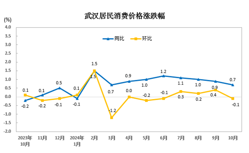 11月17日,记者从国家统计局武汉调查队获悉,10月份,受食品类价格和交通价格下降等影响,武汉居民消费价格总水平由涨转降,环比下降0.1%;同比上涨0.7%,较上月收窄0.2个百分点。