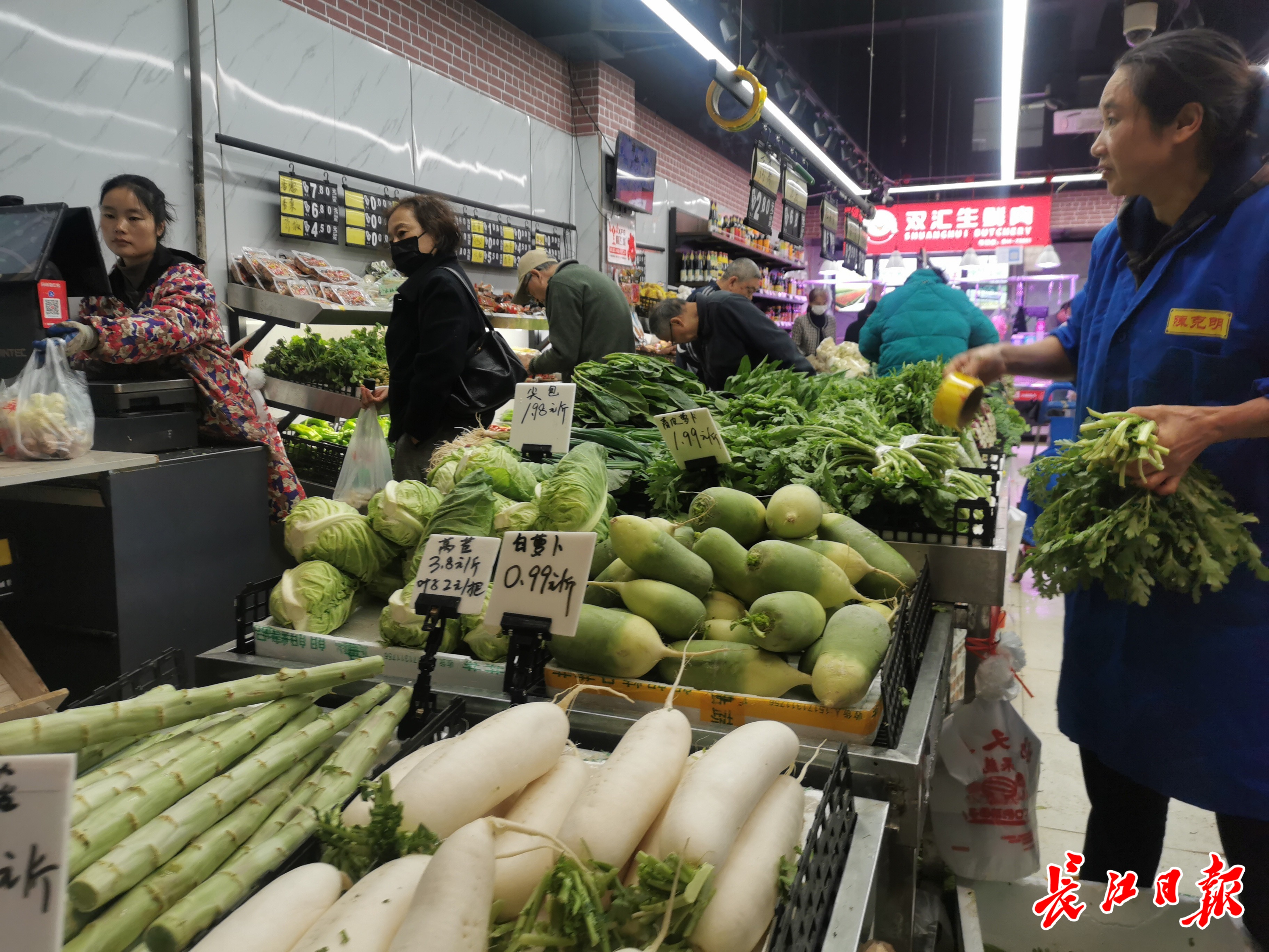 11月16日上午,记者在汉口百大鲜生世博园店看到,前来买菜的市民一拨接着一拨,摊贩们忙着称重、装袋。