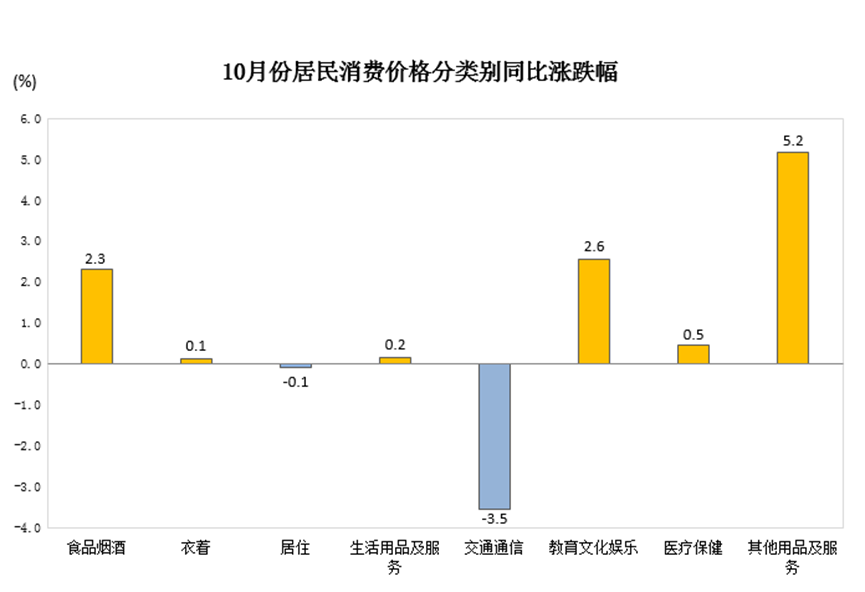 此外,10月份,受国际油价下行和新能源、燃油小汽车价格下降等影响,交通价格同比下降4.5%,降幅较上月扩大0.9个百分点,影响CPI同比下降0.45个百分点。