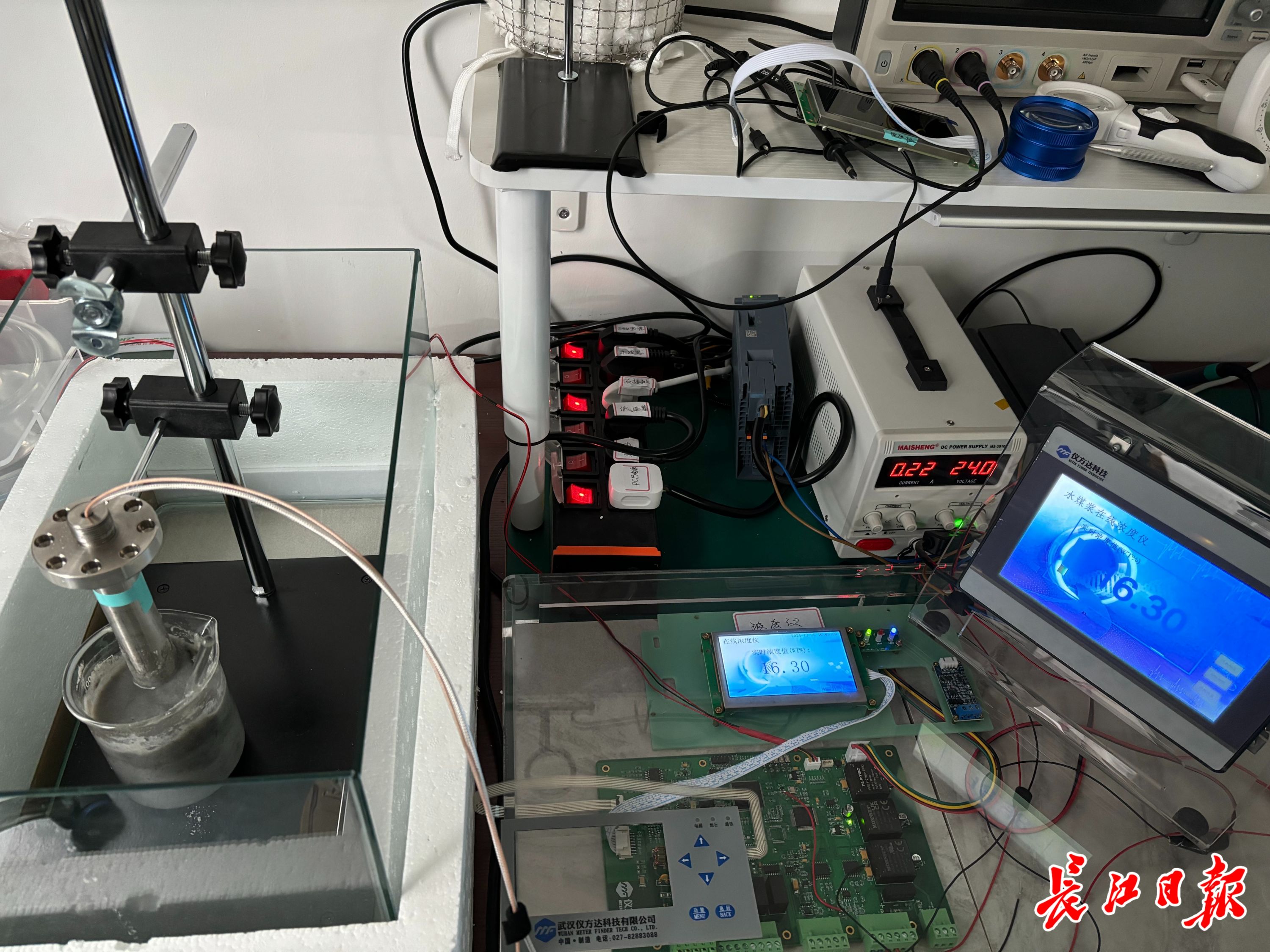 在仪方达的超声密度测量实验室里,示波器、电路板、实验器皿等堆满了实验台,一个装着浆体的烧杯里,插着一只正在实验的传感器。