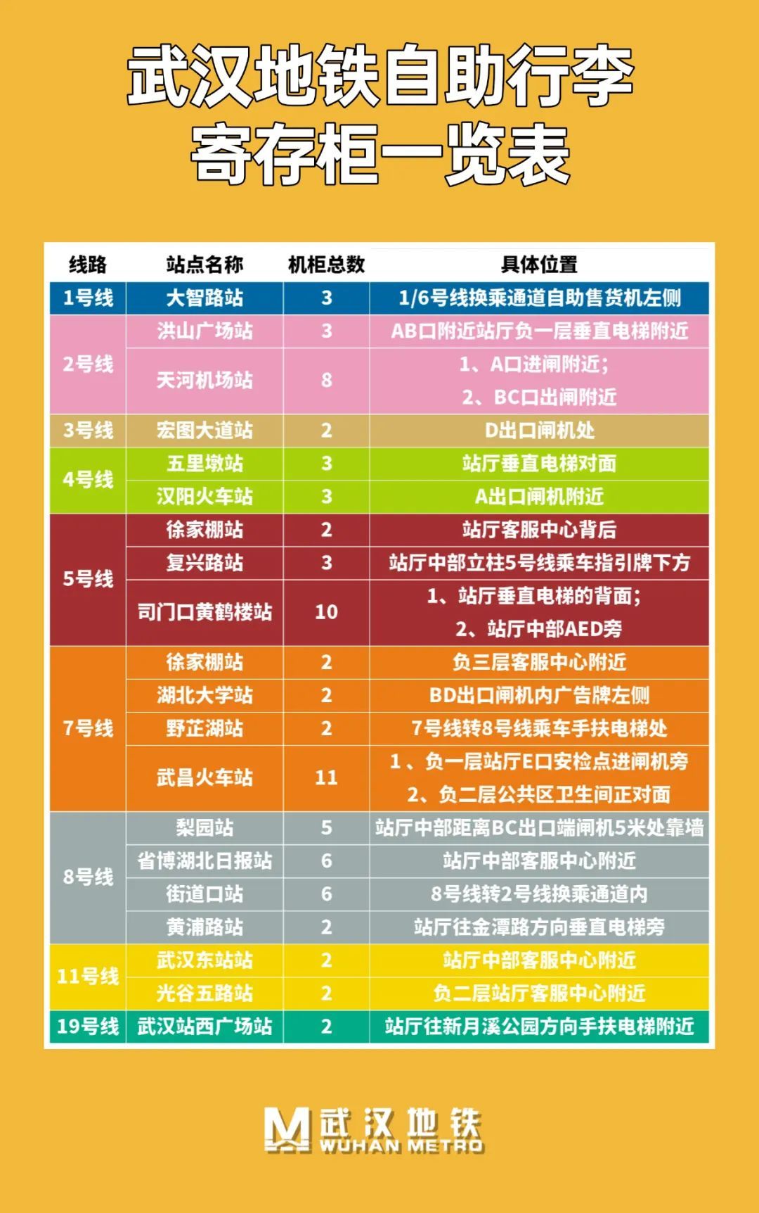 目前,武汉地铁在1号线、2号线、3号线、4号线、5号线、7号线、8号线、11号线、19号线的20个车站付费区投放79台黄色自助行李寄存柜。共有小、中、大3种规格的柜门。