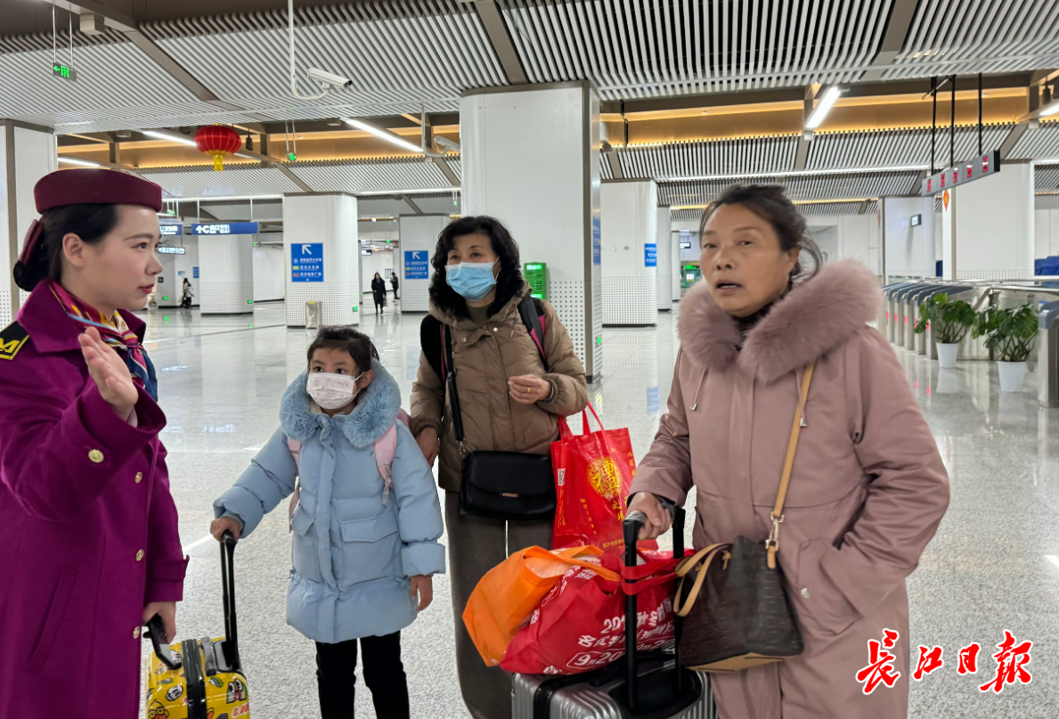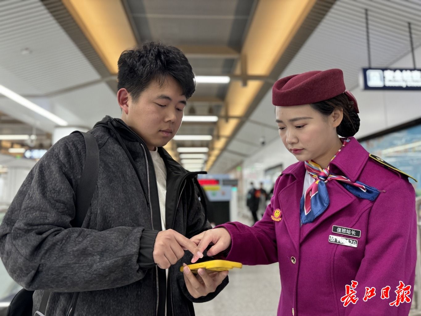19号线武汉站西广场站值班站长龙淑颖向乘客介绍乘车路线。 记者陶常宁 摄
