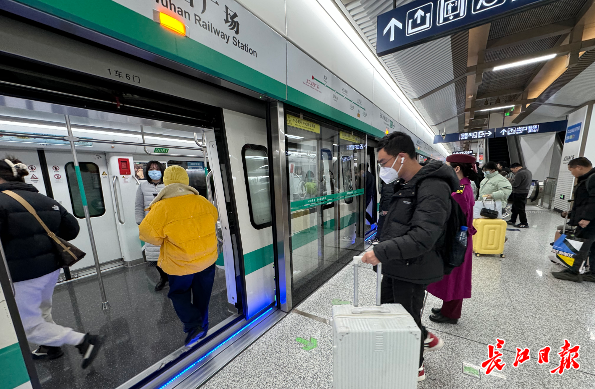 19号线武汉站西广场站,许多刚下高铁的乘客推着行李箱乘车。 记者陶常宁 摄
