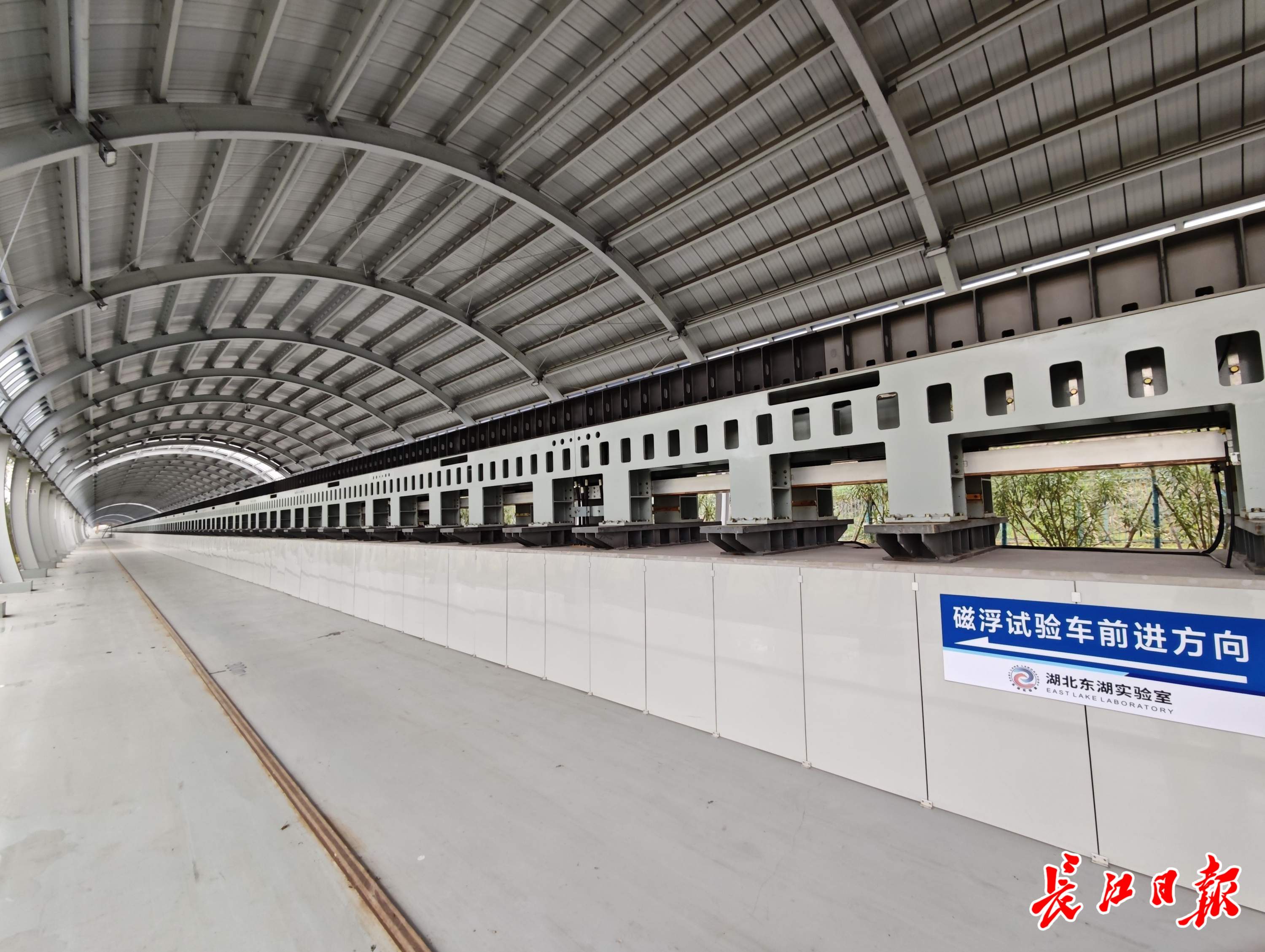 从空中俯瞰,高速磁悬浮测试线如一根锃亮的“金箍棒”,卧于绿茵之上,整体长度达1公里。