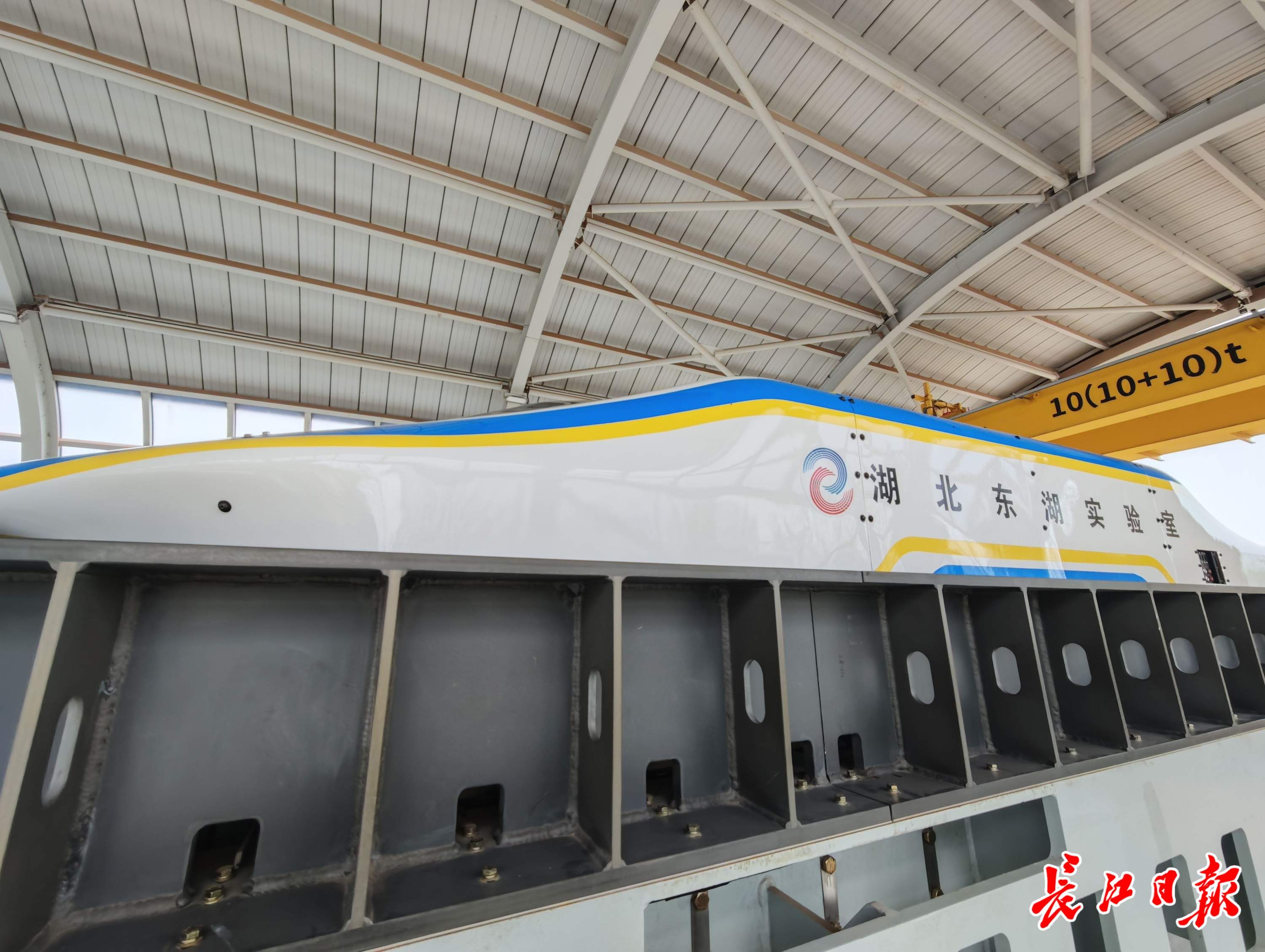 从酷似高铁站站台的入口进入,记者看到,其内部深邃空远,磁悬浮跑道在约1米高的基台上一线贯穿内部空间,一部测试模型车停于轨道上,体积虽小,重量却超过1吨。