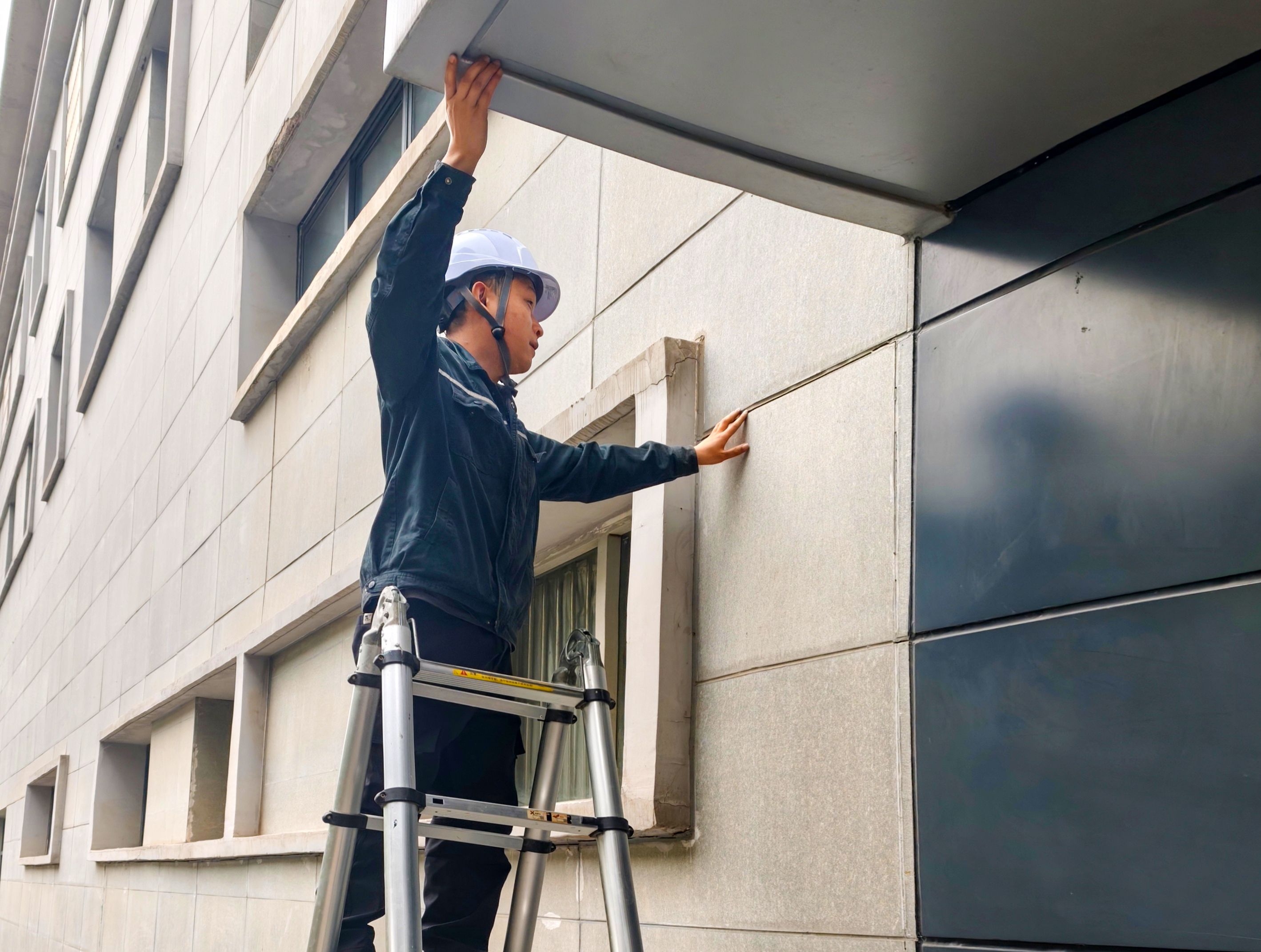 8日上午,专业维修人员在1号线滠口新城站出入口检查外饰板。 通讯员张驰宇 摄