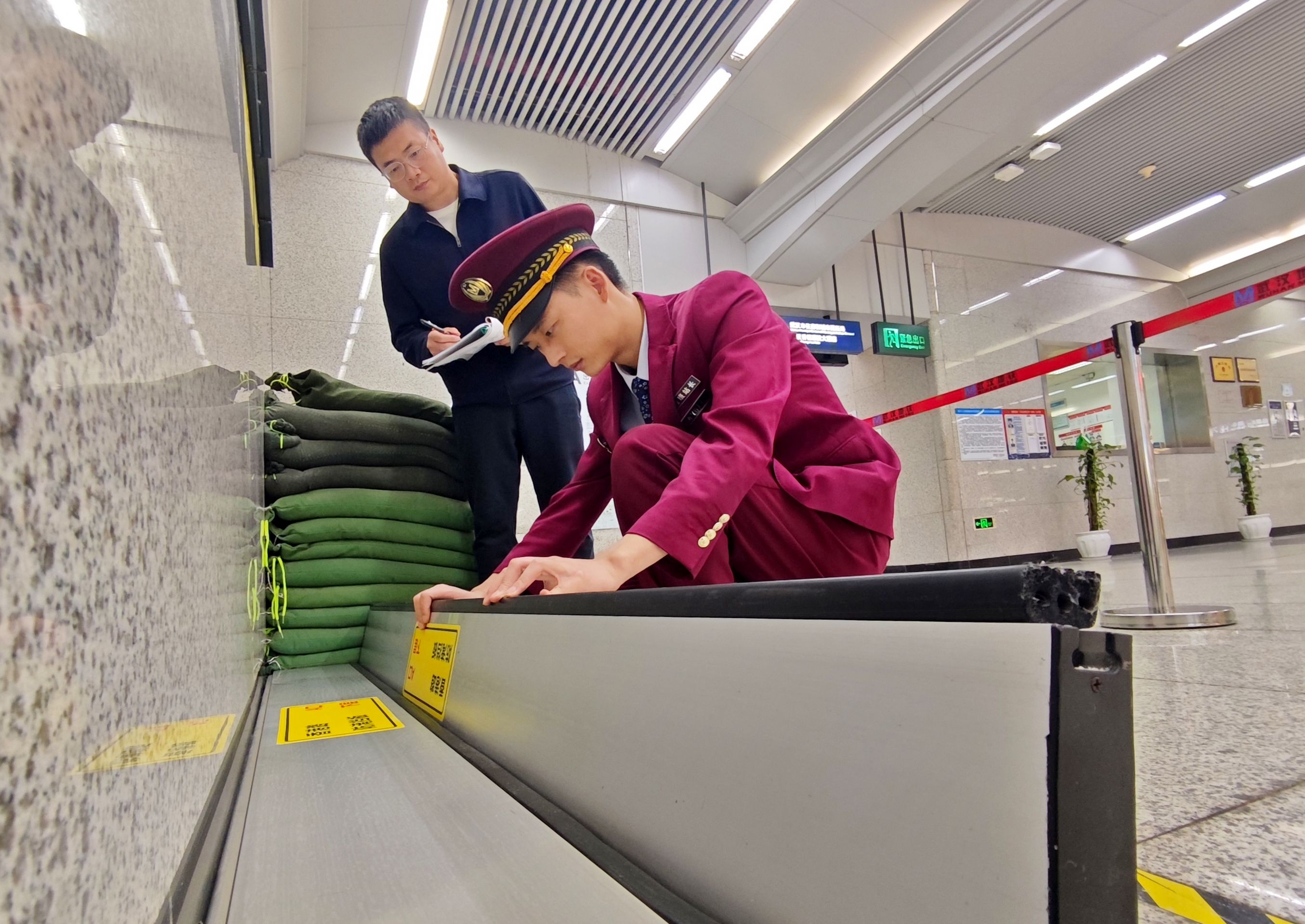 8日上午,香港路站值班站长郑泽钰检查出入口防淹挡板。通讯员杨浩 摄
